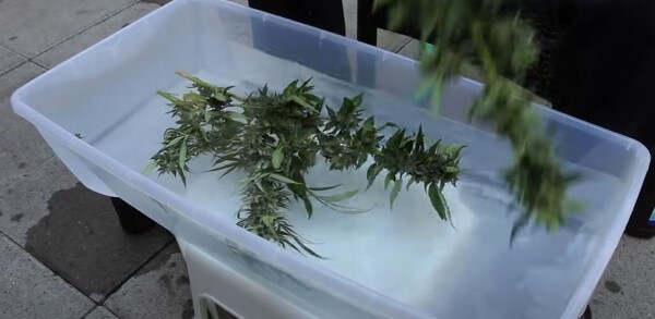 Then place your newly harvested weed branches with white powdery mildew into the first bucket.